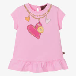 The girls pink cotton chain T-shirt by AIGNER features a charming pink and gold heart chain necklace print on the front, along with the signature 'A' horseshoe logo for a distinct designer touch. Made from soft and stretchy cotton jersey, it ensures comfort and ease of wear. This casual crew neck T-shirt is perfect for everyday wear. Limited quantities available – last chance to buy!
