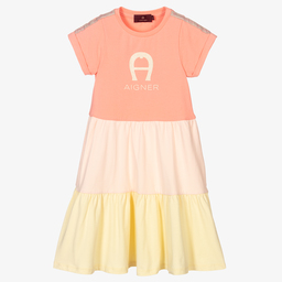 Adorable pink dress for little girls by AIGNER, made in soft and comfortable cotton jersey. It has a gold foil butterfly motif on the front, together with the brand's signature logo prints. The skirt has a lovely gathered tulle overlay and the dress fastens easily with poppers on the back.