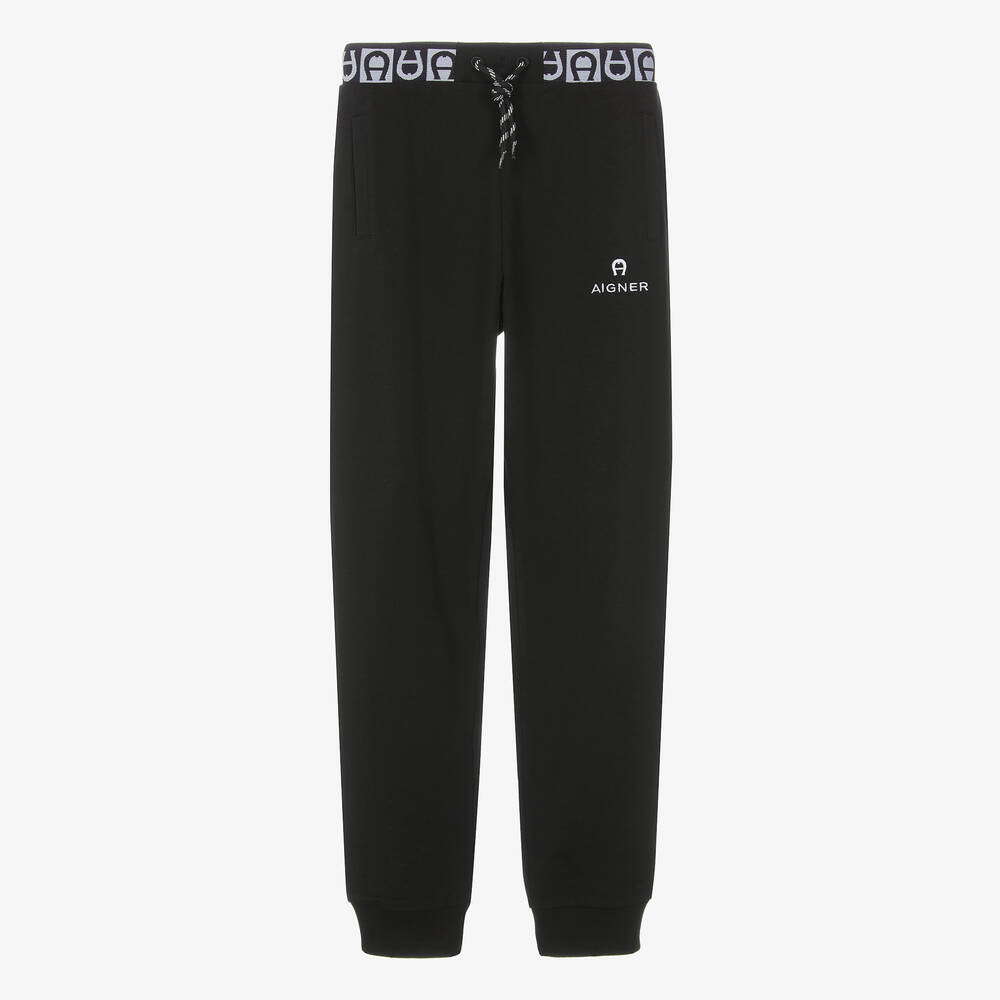 Teen boys black cotton joggers by AIGNER offer a blend of style and comfort with an elasticated waistband featuring the brand's signature 'A' horseshoe pattern and white logo embroidery on one leg. These joggers, crafted from soft sweatshirt jersey, have cuffed ankles, front pockets, and a faux drawstring for a casual look. Limited quantities available, making this the last chance to buy.