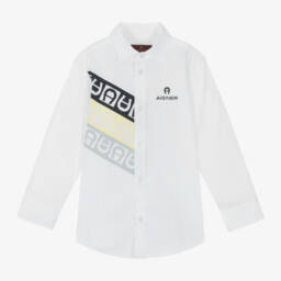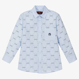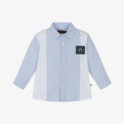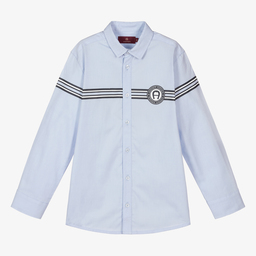 Smart casual blue and white striped shirt for teen boys by AIGNER, made in soft Oxford cotton. It has white cotton poplin trims and a navy blue logo print across the front. There are logo branded button fastenings on the front.