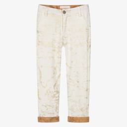 Girls beige trousers with geo accents by Alviero Martini offer a sophisticated touch with their unique woven cotton fabric. The trousers feature a stylish geo-patterned belt and waistband, adding a distinctive flair to the classic beige design. Perfect for spring and summer outings, these trousers provide a comfortable fit for young girls, making them a versatile addition to any wardrobe. Limited quantities available, making this a must-have item for the season.