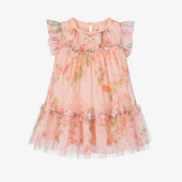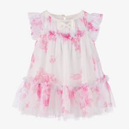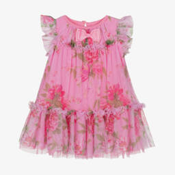 The blue floral frock for baby girls by Angel's Face is crafted in soft tulle with a charming rose pattern. Perfect for a special occasion, it features a romantic bow on the bodice and delicate flutter sleeves. The dress is lined with soft jersey to ensure comfort and has a neat keyhole button fastening at the back. Limited quantities available, making it a unique addition to any wardrobe.