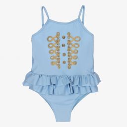 Girls pale blue swimsuit from Angel's Face, made in stretchy nylon with SPF 50+ protection. Fully lined, this beautiful one-piece has gold military-style braiding and buttons on the front. It has adjustable shoulder straps and ruffles around the hips.