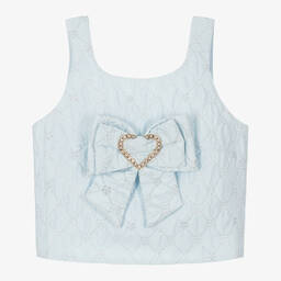 Gorgeous blush pink top for girls by Angel's Face. So lovely for a special occasion, this sleeveless top is made in a lightweight jacquard in a pretty gold flower and checked pattern. There is a detachable statement bow on the front with a diamanté heart centrepiece for extra sparkle. Shorter in length to sit on the waist, it has a cut-out back with a branded golden heart button fastening and an elasticated strap underneath for a good fit. It is fully lined in soft crêpe for comfort. Limited quantities available.