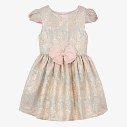 Teen girls gold and blue jacquard dress by Angel's Face features a stunning green-blue, pink, and gold floral pattern. Adorned with a large grosgrain ribbon bow and a golden angel wings charm, this exquisite dress fastens with a branded zip at the back. The glittering jacquard fabric and tulip short sleeves add a touch of elegance, while the lightweight crêpe lining ensures comfort. Limited quantities available – last chance to buy.