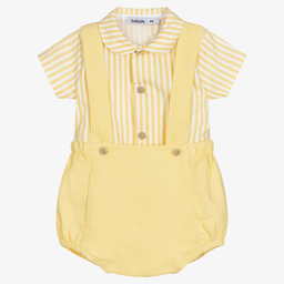 Pale blue shorts set for little boys by Babidu. The blue and white striped cotton shirt has beige button fastenings on the front. The blue bloomer-style shorts are made in a cotton and linen blend, with cross-over shoulder straps and gently elasticated cuffs.