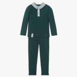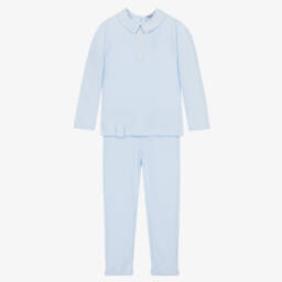 In a lovely shade of pale blue, this casual trouser set for boys is by Spanish brand Babidu. Cosy and comfortable, it is made in soft knitted jersey with a warm fleecy inside. Back popper fastening, the top has a striped woven collar and faux front button placket, with a matching button tab on the hem. The trousers have a gently elasticated waist and fixed turn up hems.