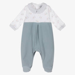 This pale blue babygrow for baby boys by Babidu is made in soft cotton-blend velour. It has a delicate star-patterned voile panel across the chest, with a sweet Peter Pan collar to match. There are cute bear-shaped pockets and the babygrow fastens neatly on the back with poppers.