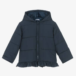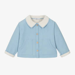 Adorable pale pink jacket for younger girls by Babidu, made in soft cotton jersey with a pointelle zigzag pattern. Lightly padded, it fastens on the front with mother-of-pearl buttons and has a white Peter Pan collar with frilled trim. The pleats on the front and back give this sweet jacket a fuller shape.