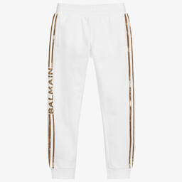 Black jersey joggers for both teen boys and girls by luxury French designer Balmain. Combining a sporty luxe look with comfort, they have side panels with an 80's inspired, graffiti design in black, pink, white and blue. The brand's white logo is printed on the waistband.