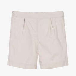Smart-casual beige cotton shorts for boys by classic British designer Beatrice & George, exclusive to Childrensalon. Ideal for warmer days, they are made in lightweight twill with inverted pleat detailing on the front. Lined in voile for comfort, they have a semi-elasticated waistband with an adjustable waistband for a great fit.
