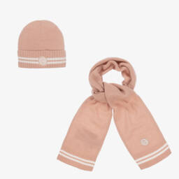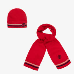 Warm and cosy, a navy blue beanie hat and scarf set for boys and girls by British heritage brand Beatrice & George, knitted in a beautifully soft Merino wool and cashmere blend. Exclusive to Childrensalon, the hat has a ribbed, turned-up brim striped in red and white, with a central, embroidered red monogram crest logo. The scarf has matching ribbed trims, with a coordinating logo on one end.