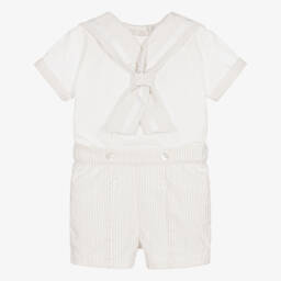 Exclusive to Childrensalon, a smart red velvet shorts set for boys by British heritage brand Beatrice & George. Made in lightweight cotton, the shirt has traditional red and blue hand smocking across the front, with coordinating hand embroidery on the Peter Pan collar and cuffs. It fastens with buttons on the back and has button fastenings on the front and back that attach to the shorts, ensuring it always stays neatly tucked in. The soft, red velvet shorts have inverted pleats on the front and are fully lined for comfort. They fasten with a button on one side.