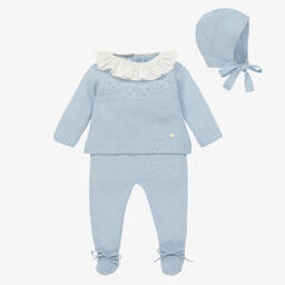 Unisex grey knitted cashmere blend set by Beatrice & George, exclusive to Childrensalon, is a traditionally-styled two-piece babygrow set. It features a soft cashmere and wool blend with a scalloped pattern, ribbed trims, and an ivory ruffle collar. The mother-of-pearl logo charm and button fastenings on the back add elegance, while the gently elasticated waistband and bows on the ankles ensure comfort. Limited quantities available—last chance to buy this charming set.