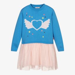 Girls blue cotton T-shirt dress by Billieblush is made from soft organic cotton jersey. Featuring a playful 'PINK' print and sequinned flamingo with glittery accents, this dress adds a fun touch to any wardrobe. The crew neck and drop-shoulder short sleeves with ruffle trim provide comfort and style. Perfect for casual wear, it's an essential for spring and summer. Limited quantities available, last chance to buy.