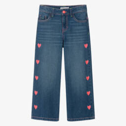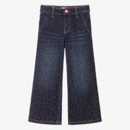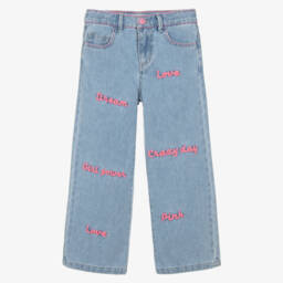 Girls blue denim embroidered jeans by Billieblush are a delightful addition to any wardrobe. Made from soft cotton denim, these regular fit jeans feature a classic five-pocket design, contrast stitched detailing, and vibrant embroidered hearts, palm trees, and rainbows down one leg. The sparkly pink popper fastenings and bold yellow embroidered logo on the adjustable waistband add a playful touch. Limited quantities available – last chance to buy!