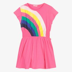 Girls mint green dress by Billieblush, made with soft and stretchy cotton jersey. Lightweight and comfortable, it has an all-over white cloud print, a large rubberised neon pink heart, and blue, yellow and pink glitter sun rays. There is a shirred elastic waist and stylish capped sleeves.