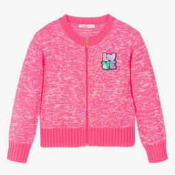 Beautifully bright neon pink cardigan for little girls by Billieblush. This softly knitted piece has an oversized collar with delicate pointelle detailing and scalloped edges. Great for layering, it fastens on the front with colourful glittery buttons. It has a bright pixel heart on the front, complete with sequin accents, for a striking, sparkly look.