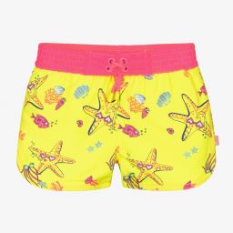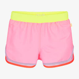 These bright pink swim shorts for girls are by Billieblush. Bold and eye-catching, they are patterned with fun heart-shaped pineapples. They are made in a smooth and breathable fabric, with a stretchy elasticated waistband for easy, pull-on wear.