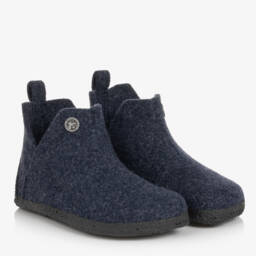 Boys grey felt ankle slippers provide a cosy haven for little feet, crafted by Birkenstock with a narrow fit. The wool blend offers warmth, while the natural cork footbed, lined with soft leather, provides anatomical comfort. The latex-coated sole enhances grip for safe indoor adventures. Featuring a subtle logo, these slippers are both stylish and practical. Limited quantities available, suitable for adding a touch of luxury to any lounging day.