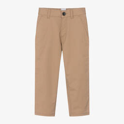 Boys navy slim chino trousers by BOSS are crafted from smooth cotton twill, featuring an adjustable waistband for a perfect fit. The trousers fasten with a zip and branded button and include two slanted front pockets and two back pockets. The signature stripes on the back pocket and inner waistband add a unique touch. Limited quantities available, last chance to buy these stylish and versatile chinos for every occasion.