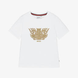 Boys black cotton t-shirt with a golden dragon by BOSS offers a stylish nod to the Lunar New Year. Crafted from soft jersey, it features a striking gold dragon motif and signature logo on the front, enhanced by designer tape inside the neckline. Perfect for a casual yet sophisticated look, this t-shirt is ideal for young fashion enthusiasts. With limited quantities available, it's a last chance to add this exclusive piece to the wardrobe.