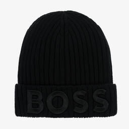 Navy blue beanie hat for boys by Boss, knitted in soft ribbed cotton. Warm and cosy, it has a turned-up brim with a large tonal embroidered logo on the front for a subtle designer statement.
