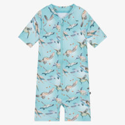 The boy beige smiley face print sunsuit by Molo offers a playful touch with its vibrant smiley face pattern. Crafted from smooth, stretchy recycled fabric, it provides UPF50+ protection, making it perfect for sunny days at the beach. The design features a practical long zip with a chin guard for easy wearing. With limited quantities available, this is a last chance to add a touch of fun and functionality to a young wardrobe.