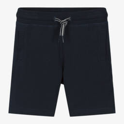 Casual navy blue shorts for boys by Boboli, made in soft cotton jersey. Ideal for relaxed days spent lounging, they have a stretchy waist with a striped, adjustable drawstring for a comfortable fit. There are pockets on the front and a small branded tab on the back.