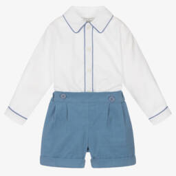 Traditional blue shorts set for boys from Rachel Riley, made in soft cotton. The ivory shirt is made from a soft piqué and has a smart collar, blue trims and fastens with buttons down the front. The coordinating blue shorts are made in soft corduroy and have turn-up cuffs and a partially elasticated waistband for a comfortable fit. This smart set fastens together with buttons, so the shirt will always stay neatly tucked in.