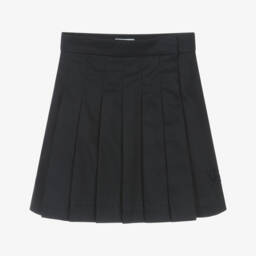 A stylish navy blue skirt for girls by luxury brand Burberry, jacquard-woven with gold and ivory unicorn motifs. Made from soft wool and silk twill, this wrap around style skirt is fully lined in smooth satin. It is beautifully pleated on the back and has a useful adjustable waistband, for a perfect fit.