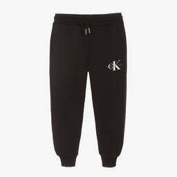Everyday black cotton joggers for boys and girls by Calvin Klein Jeans. Soft and mid-weight, they have three handy pockets and a drawstring waist. There is a white CK monogram logo print on the front for an unmistakable Calvin Klein look. They are made of at least 50% transitional cotton.