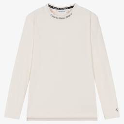 A cool black top for teen boys by Calvin Klein, made in soft and comfortable cotton jersey. This long sleeve streetwear piece is designed with an ivory intarsia logo on the front and back of the crew neckline. Stamped on one cuff is the signature Calvin Klein monogram logo in muted ivory.