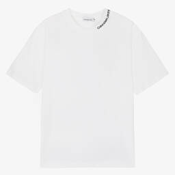 Teen boys black cotton logo T-shirt by Calvin Klein features a white embroidered logo on the ribbed crew neckline. Crafted from comfortable cotton jersey, it offers a casual, relaxed fit with short sleeves, making it ideal for everyday wear. Limited quantities available – last chance to buy.