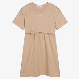 Casual orange dress for teen girls by Calvin Klein Jeans, made in comfortable cotton jersey. It has a glittery silver logo print across the front and the brand's CK monogram logo on one sleeve. An easy-to-wear style, the dress is layered at the front to give the impression of a two-piece, with a gathered skirt.