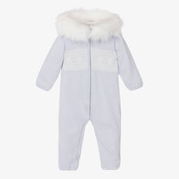 Cosy beige pramsuit for baby boys and girls by Caramelo Kids, knitted in beautifully soft cotton. Lined in jersey for warmth, this lovely pramsuit has a sweet Fair Isle pattern across the chest in white. It fastens easily at the front with a zip and has a hood with a beautifully soft faux fur trim, which attaches with buttons for an alternative look.
