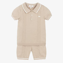A lovely pale blue top and shorts set for boys by British brand Caramelo Kids. Finely knitted in soft cotton, both pieces have a white striped trim and classic cable stitch detailing. The polo-style top has a short placket with mother-of-pearl buttons to fasten. The shorts have a ribbed elasticated waist for a comfortable fit.