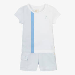 The beige and white shorts set for boys by Caramelo Kids offers an effortlessly stylish look. Crafted from soft cotton piqué, the T-shirt features a ribbed neckline and a subtle embroidered logo, adding a touch of sophistication. Paired with comfortable jersey shorts, this set includes practical pockets and a drawstring waistband for a perfect fit. Ideal for spring and summer adventures, this outfit is both fashionable and functional with limited quantities available.