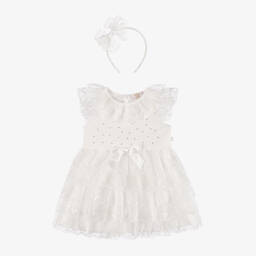 The girls pink lace and diamanté dress and headband set by Caramelo Kids is a charming ensemble crafted from soft jersey with delicate lace detailing. Featuring a sparkling diamanté bodice and ruffled tulle layers, it has a keyhole button fastening at the back for ease of dressing. A matching satin hairband with an embroidered bow completes this delightful set. Ideal for special occasions, limited quantities available, so secure this enchanting outfit today.
