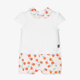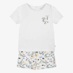 A lovely white babysuit set for boys and girls by French brand Carrément Beau. Comprising a babygrow, bodyvest and bib, the outfit features sweet mother and baby bear themed prints, with the words 'Mon Bebé'. All pieces are made in comfortable organic cotton jersey and fasten easily with poppers. There is an absorbent towelling lining on the bib, with an envelope neckline on the bodyvest to assist with dressing.