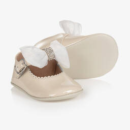 Exclusive to Childrensalon, a pair of pale blue patent leather pre-walker shoes for baby girls by Children's Classics. Made and lined in soft, supple leather, they have a detachable chiffon and diamanté bow on the buckle-fastening strap. There is pretty scallop detailing around the front and the leather soles are flexible for comfort.