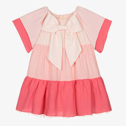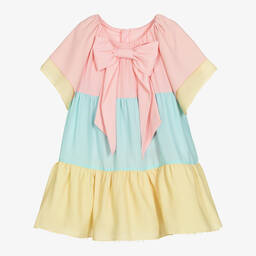Pretty tiered dress for girls by Childrensalon Occasions, made in soft crêpe chiffon in shades of blue. Gathered around the neckline and with wide, double sleeves, it has a large, eye-catching, fixed bow on the bodice. Fully lined in pale blue cotton voile, the lower tier has a blue tulle frill for extra volume, which can be seen below the hemline. It fastens with a neat, concealed zip fastening on the back.