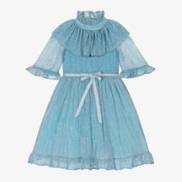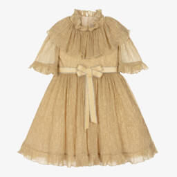 Shimmering gold plissé dress for girls by British designer Childrensalon Occasions, just right for making an entrance. It has a frilled, stand-up collar and a large ruffle around the shoulders with a curly hem, matching the three-quarter length sleeves and hemline. The contrasting grosgrain ribbon waistband is trimmed in glittery gold and the full, gathered skirt has tulle underskirts for extra volume. Fully lined in cotton voile for comfort, the dress fastens with a discreet concealed zip on the back.
