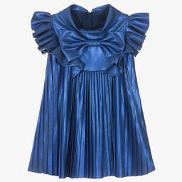 Shimmering silver dress for girls by Childrensalon Occasions, just right for a special event. It is made in soft, lightweight, pleated lamé, with an elegant fold-over neckline and an over-sized, statement bow on the front.