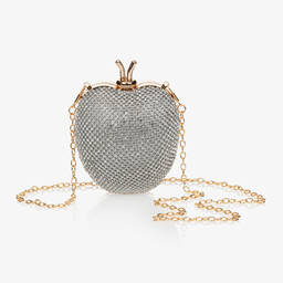 A beautiful apple-shaped, gold tone special occasion bag for girls by David Charles, covered in sparkly diamanté. It has shiny trims and a stalk-shaped snap fastening, with a small, satin-lined single compartment to carry a few essentials. This minaudiere style bag can be worn on the shoulder with the detachable chain strap or carried as a clutch for that glamorous finishing touch.