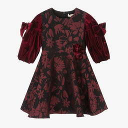 Beautiful burgundy green special occasion dress for girls by David Charles, made in mid-weight polycotton brocade. The main body of the dress is decorated in a green jacquard flower pattern, with velvet appliqués on the waist. It has puffed velvet sleeves with pretty bows, for a feminine look. Fastening with a concealed zip on the back, it has a lightweight acetate lining for lasting comfort and layers of tulle for a voluminous skirt.