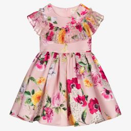 Girls pale lime green satin dress by British designer David Charles, with a colourful floral print. It has sheer plummeti chiffon ruffles across the bodice and back, and a matching fixed bow on the back. Fully lined in cotton voile, with a tulle frill for extra volume on the full skirt.