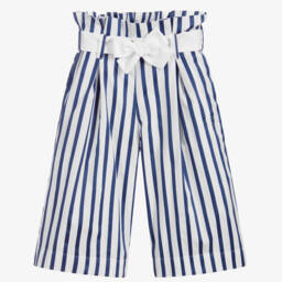 Girls pale blue chambray harem pants by Desigual made to look like denim with faded, worn patches. In a comfortable style, they have a stretchy, elasticated waistband and hems to create their signature baggy style. They have pretty embroidery and flowers on the leg with silver sequined pockets.