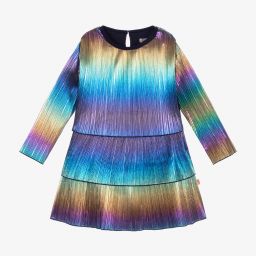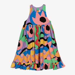 Girls cotton jersey, sleeveless dress by Desigual featuring an aztec style print in bright colours with a subtle black printed statement that reads 'Say something nice' just above the hem on one side. Very comfortable to wear for party or play, it falls below the knee and has buttons to pin up the hem to create a pretty shape.