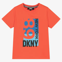 Boys bright lime green organic cotton T-shirt by DKNY. This casually styled top is made in a soft and comfortable jersey and has a crew neck and short sleeves. It has a blue and pale khaki green New York inspired logo print on the front for a cool designer finish.